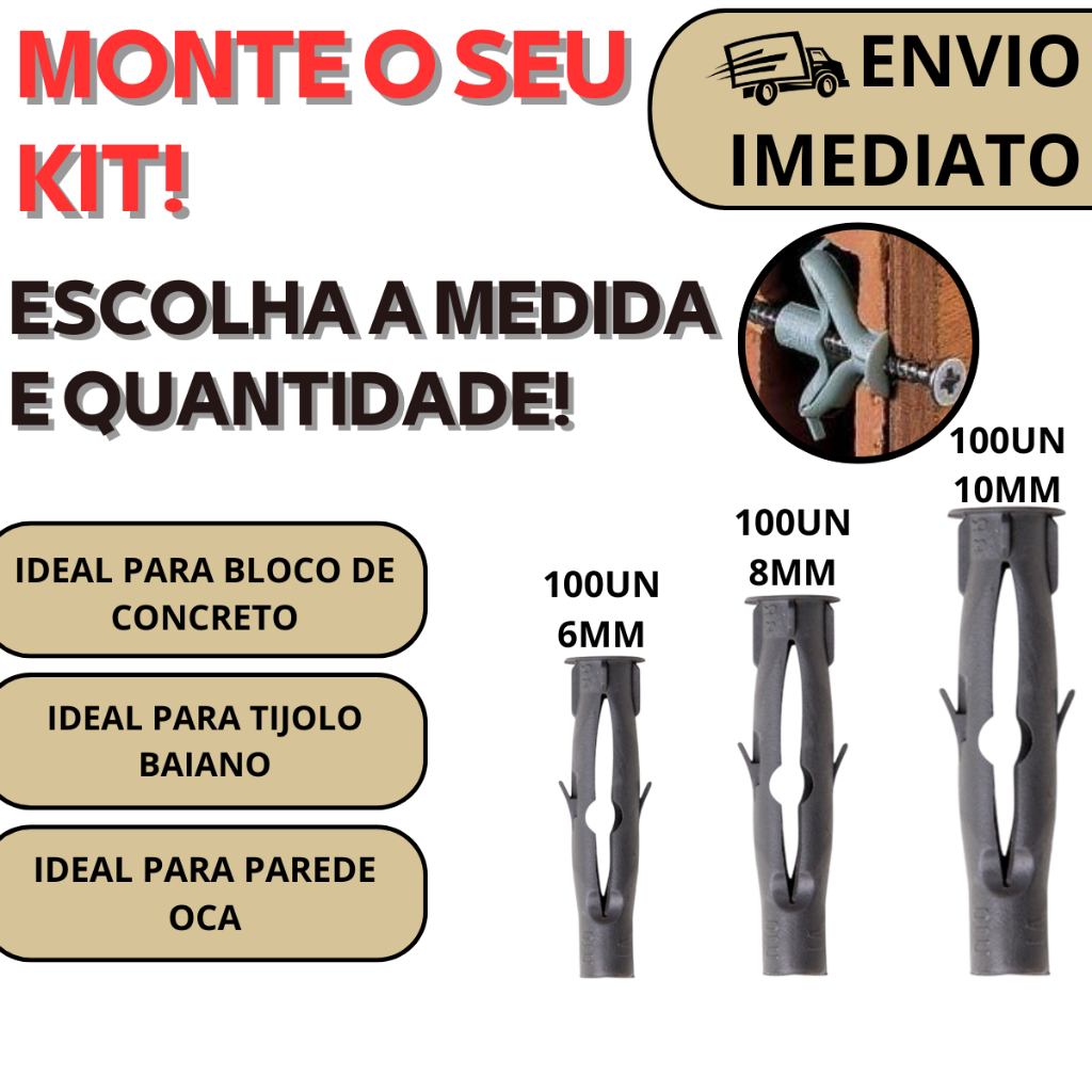 MONTE SEU KIT de Bucha Baiana com Parafuso 6 - 8 - 10 para Tijolo Oco Furado Kit Bucha FU 6mm 8mm 10mm para Bloco Vazado