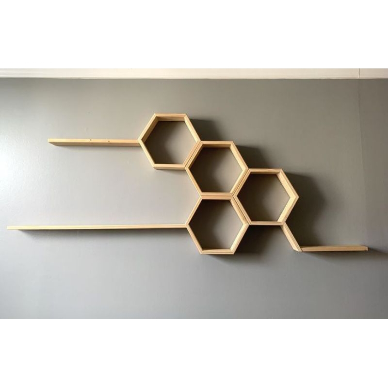 kit 4 nichos sextavados+3 prateleiras em madeira pinus