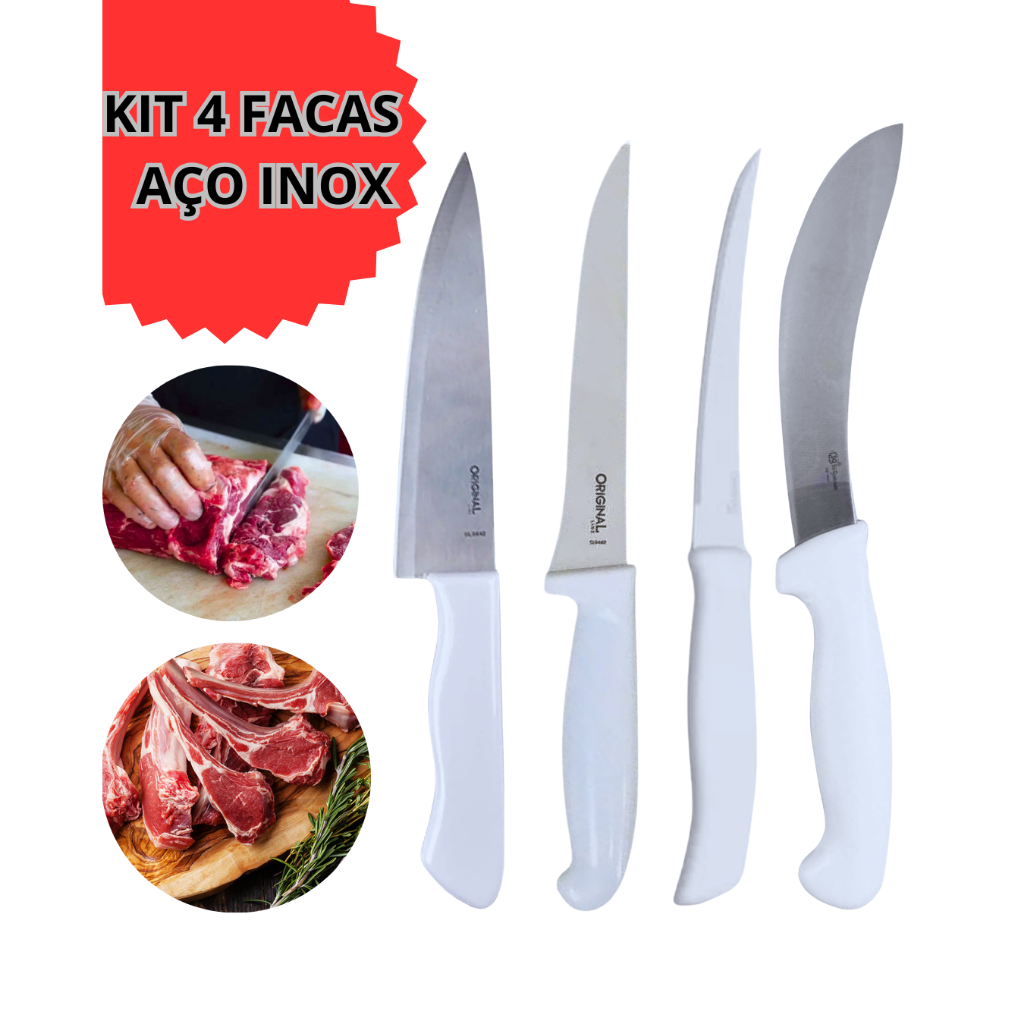 Jogo de Facas Aço Inox Kit 4 Peças Cozinha Cabo Branco Faqueiro Conjunto Facas para Carne Legumes 5" e 6"