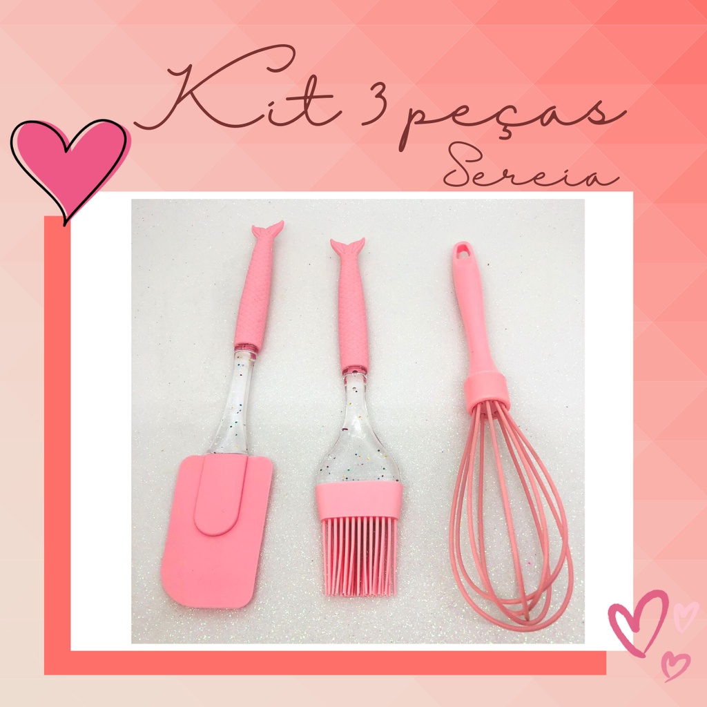 Kit 3 peças Sereia rosa com espátula, pincel e batedor fue com brilho