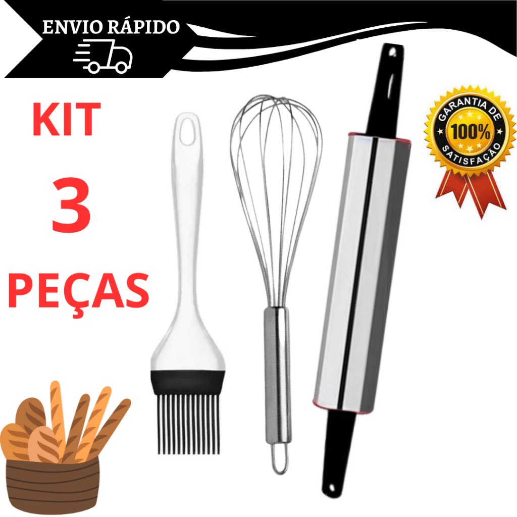 Kit com 3 Peças Confeiteiro Fue Inox Pincel de Silicone e Rolo de Abrir Massas