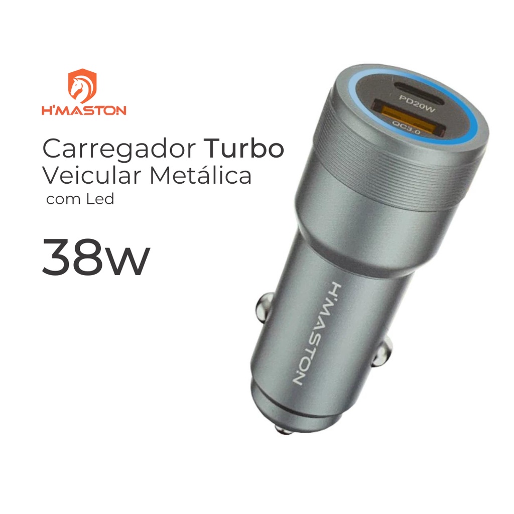 Carregador TURBO Veicular Metálica 38w com Led /Qualidade e Segurança / USB padrão - USC tipo C / H'maston L07