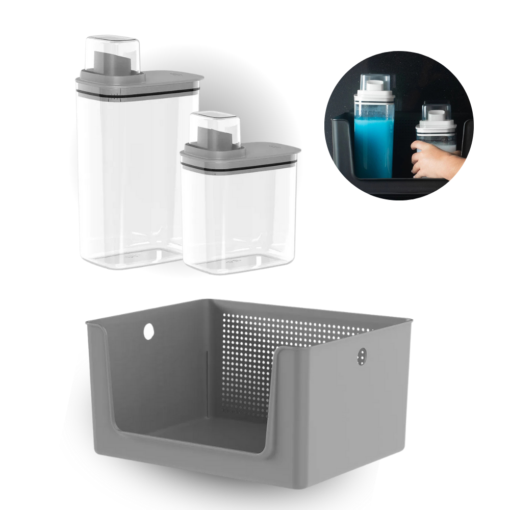 Kit Organizador de Lavanderia Cesto 16L + 2 Dispenser 1,5L e 2,3L Porta Sabonete Amaciante Alvejante