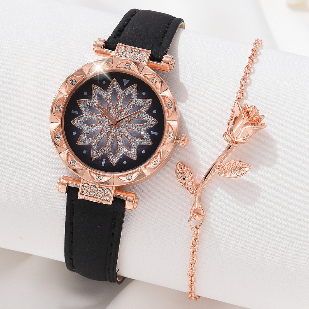 2 Pcs/Set Flower dial Em Forma De Flor Relógio De Couro Mulher Starry Sky Fashion Women Quartzo