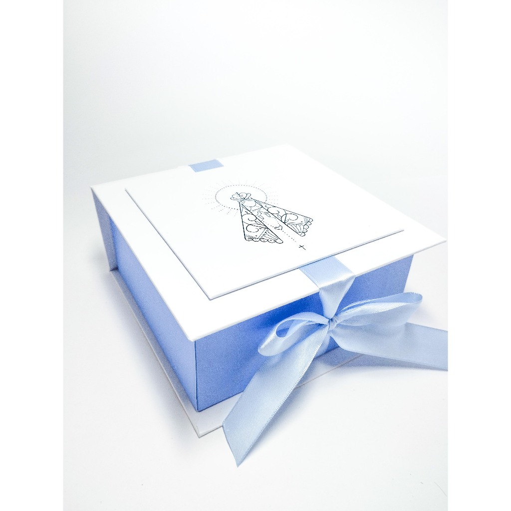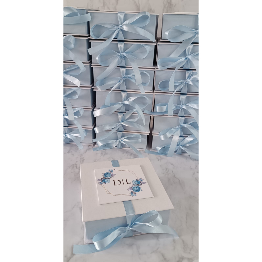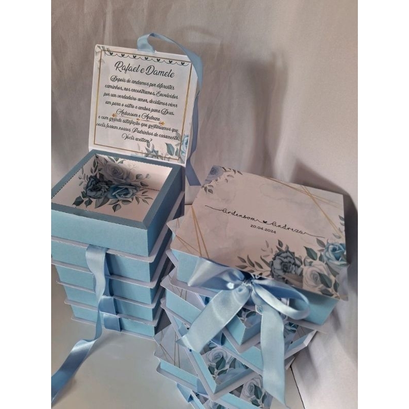 CAIXA CONVITE PADRINHOS CASAMENTO AZUL SERENITY Cartonada 15x15x7cm PERSONALIZADA com Iniciais