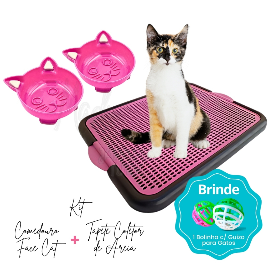 Kit Tapete Coletor de Areia para Gato Bandeja Coletora + Kit Face Cat Comedouro e Bebedouro Promoção