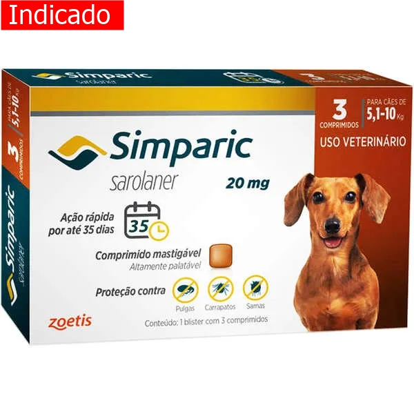 Antipulgas Zoetis Simparic 20 Mg Para Cães De 5,1 À 10 Kg Com 3 Comprimidos