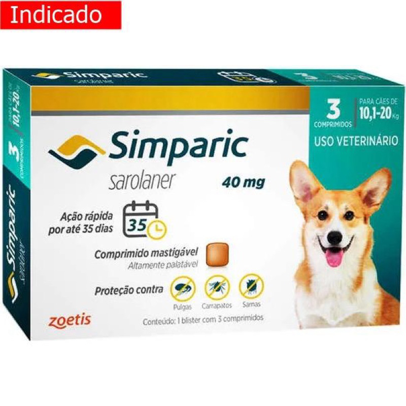 Antipulgas Simparic 40mg Cães 10,1 A 20kg - C\ 3 Comprimidos Promoção.