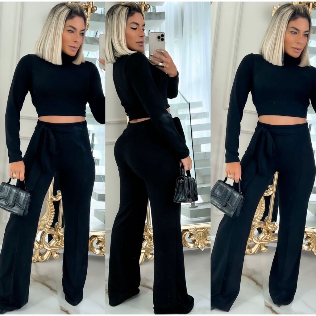 CONJUNTO CROPPED MANGA LONGA E CALÇA PANTALONA DE LÃZINHA COM CINTO FAKE EM AMARRAÇÃO BEM CHARMOSO.