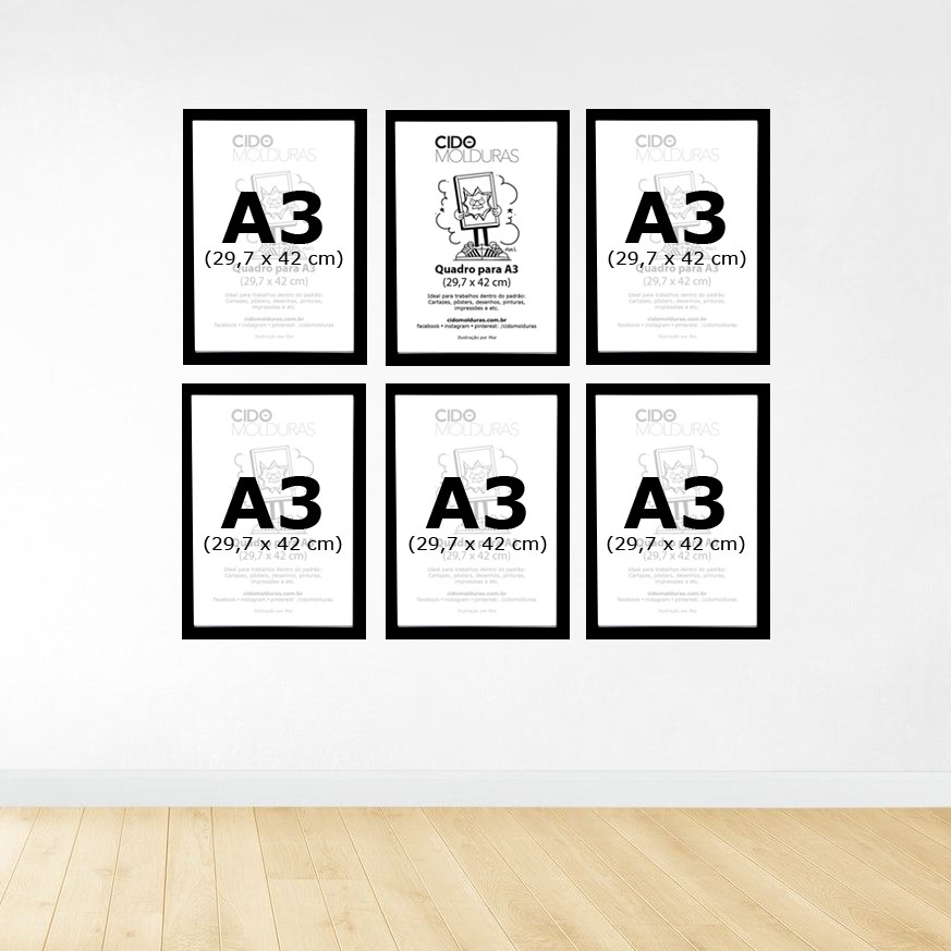 Kit 6 Quadros Prontos Tamanho A3 Moldura Preta (29,7 x 42 cm) Com Vidro para Sala, Quarto, Cozinha, Banheiro, Lavabo, Corredor, Varanda, Área de Churrasco, Escritório, Empresa, Espaço Home Office e Etc.