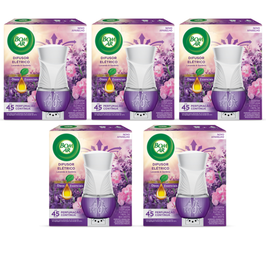 KIT COM 5 Bom Ar Difusor de Aromas Elétrico Lavanda e Gerânio COMPLETO