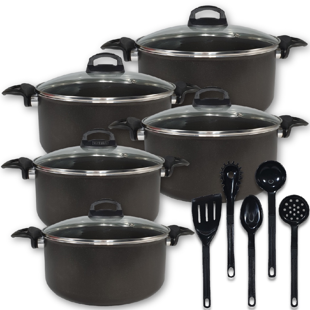 Jogo De Panelas Plus 10 Peças Caçarolas 16 a 24 cm Antiaderente Teflon com Tampa de Vidro Preto Grafite