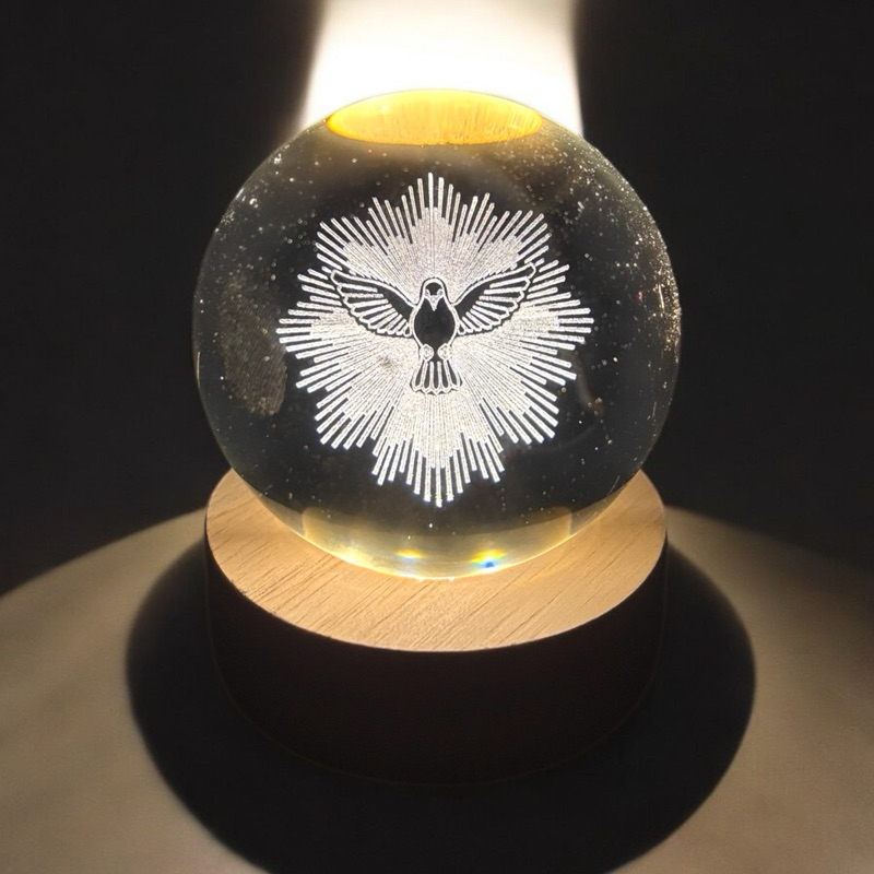 Luminária Abajur Mesa Bola de Cristal Divino Espírito Santo 7 cm Luz LED 3d Decorativa Esfera Bivolt