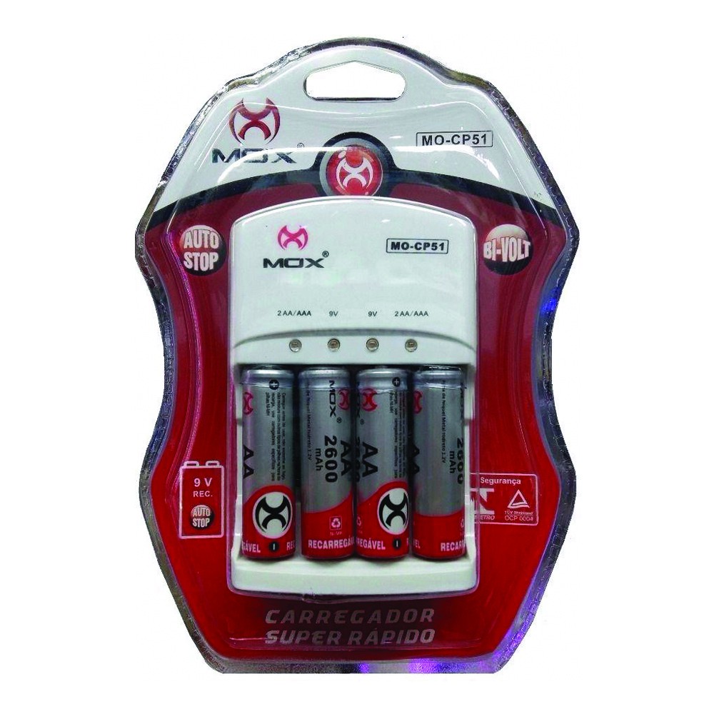 MOX CP51 Carregador De Pilhas Baterias c/ 04 Pilhas Recarregável AA Desligamento Automático