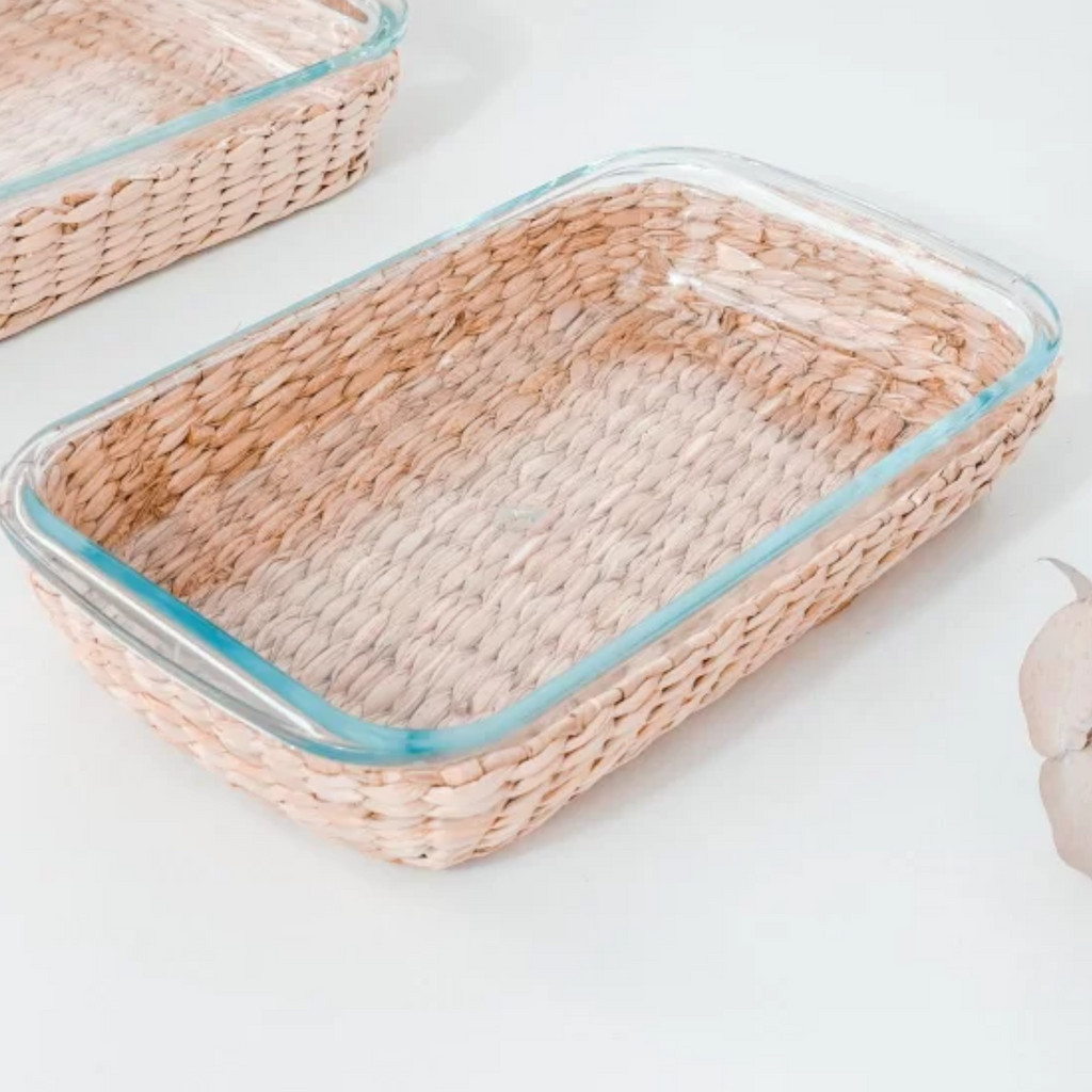 Travessa Refratário Assadeira Forma Retangular de Vidro Com Rattan 1,6 Litros