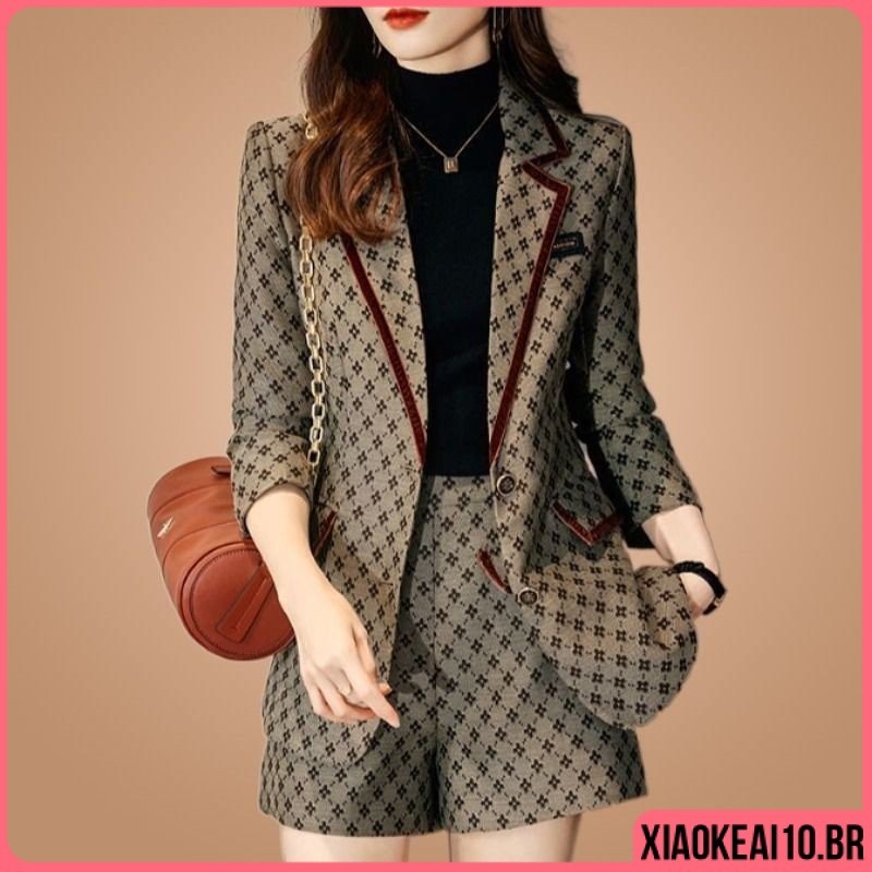 Conjunto Xadrez Feminino 3 Três Peças Roupas Femininas Social Moda Bloguerinha Max Blazer Longo Luxo Cropped Calça Jackar Varios Todos Tamanhos Plus Size Conjuntos Verão Inverno Todas Estações Terno Calca Quadriculado Chadrez Alfaiataria Premium Trijunto