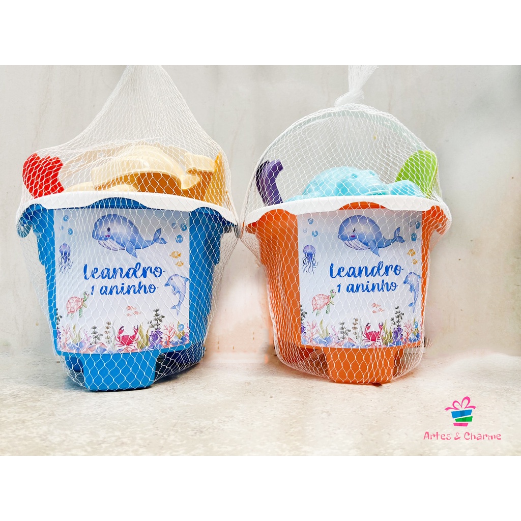 Kit com 10 Baldinhos de Praia Infantil Personalizado Tema Fundo do Mar Balde Com Acessórios 7 Pecinhas