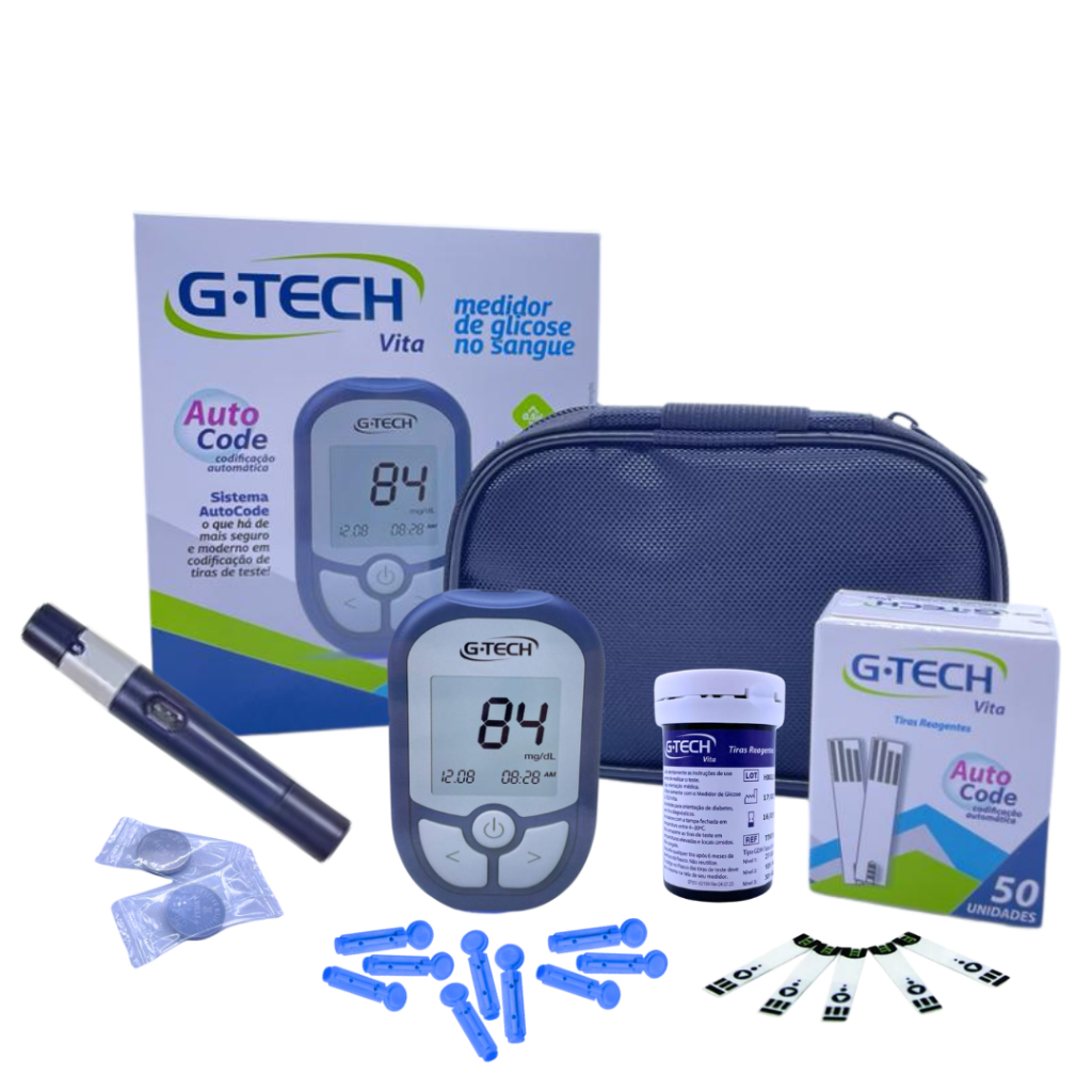 Kit Medidor de Glicose G-Tech Vita Com 60 Tiras + 110 Lancetas E Caneta Lancetadora - Glicosímetro Glicemia