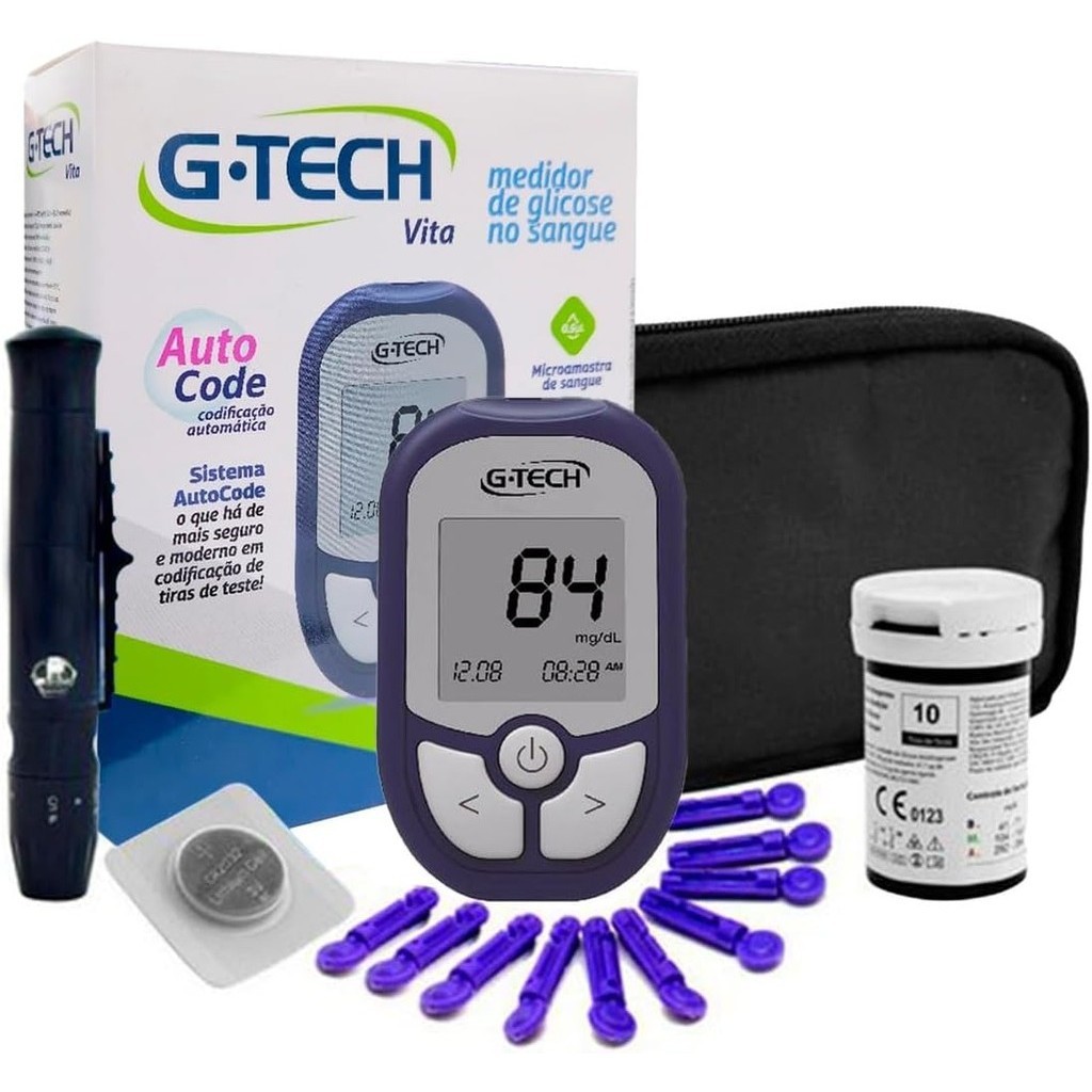 Kit Medidor de Glicose G-Tech Vita Com 10 Tiras + 10 Lancetas E Caneta Lancetadora - Glicosímetro Glicemia