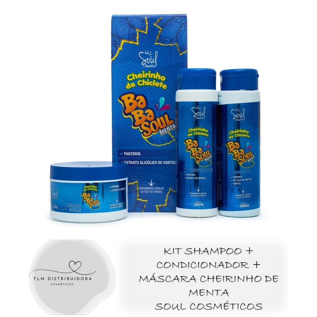 Kit Capilar 3 Peças Cheirinho de Chiclete Babasoul Menta Soul Cosméticos ( Sh 300ml + Cond 300ml + Mascara 250ml )