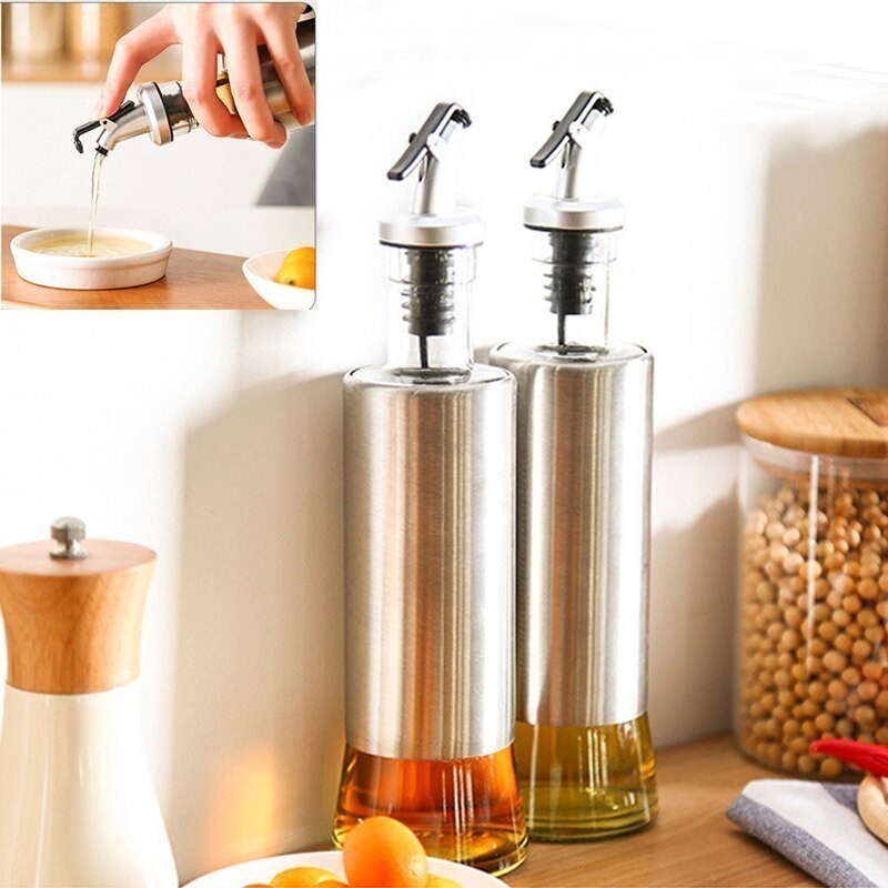 Kit de 2 peças Galheteiro com Azeiteiro e Vinagreiro de Vidro 290ml Garrafa com Bico Dosador em Inox