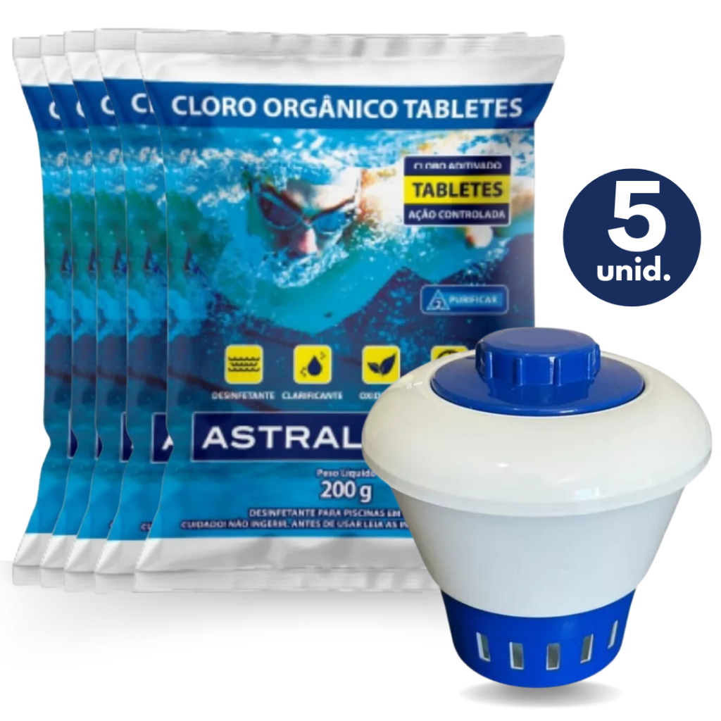 Clorador Flutuante Médio + 5 Und Pastilha De Cloro Orgânico 5 Em 1 Desinfetante Clarificante Algicida 200g Para Limpeza De Piscina