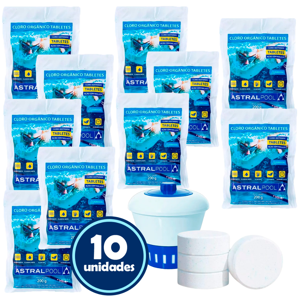 Clorador Flutuante Médio + 10 Und Pastilha De Cloro Orgânico 5 Em 1 Desinfetante Clarificante Algicida 200g Para Limpeza De Piscina