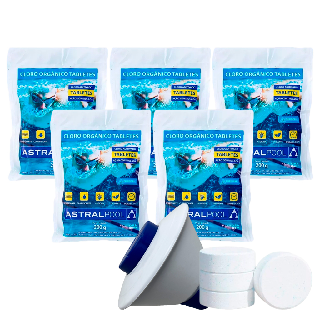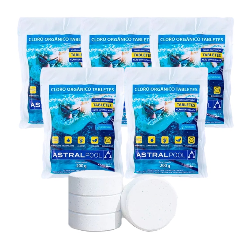 Kit 5 Pastilha De Cloro Organico 5 Em 1 Desinfetante Clarificante Algicida Oxidante Duravel 200g Para Limpeza De Piscina