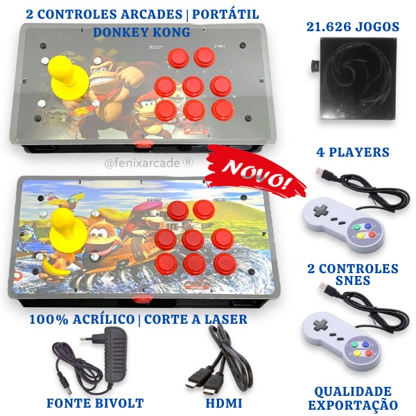 Fliperama Arcade - Kit de 2 Controles Slim Fenix Arcade em Acrílico - Modelo Crash Team Racing - com mais 2 Controles SNES Usb e 8 Botões de Comandos por Controle e 21.626 Jogos Retros Arcade Instalados.