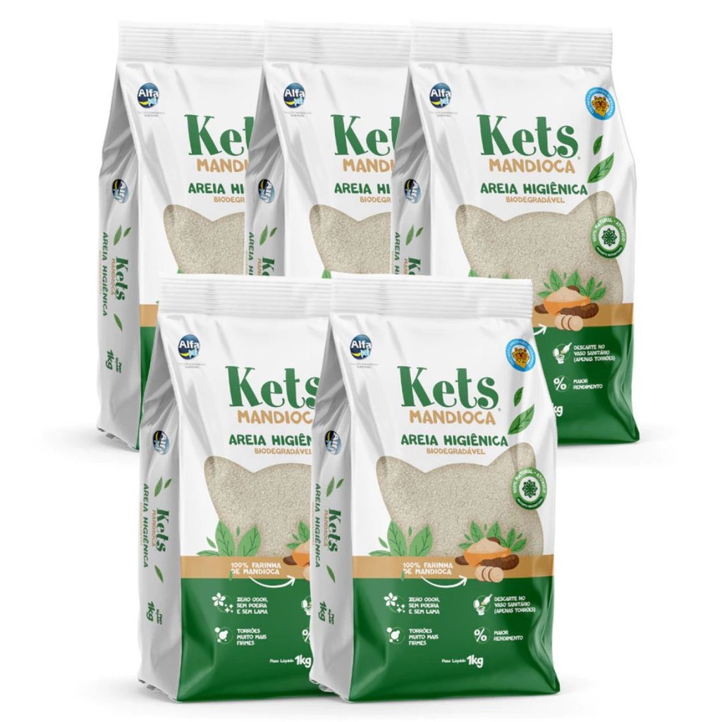 Kit com 5und Areia Para Gato Higiênica Kets Mandioca 1Kg Gatos 100% Natural Biodegradável