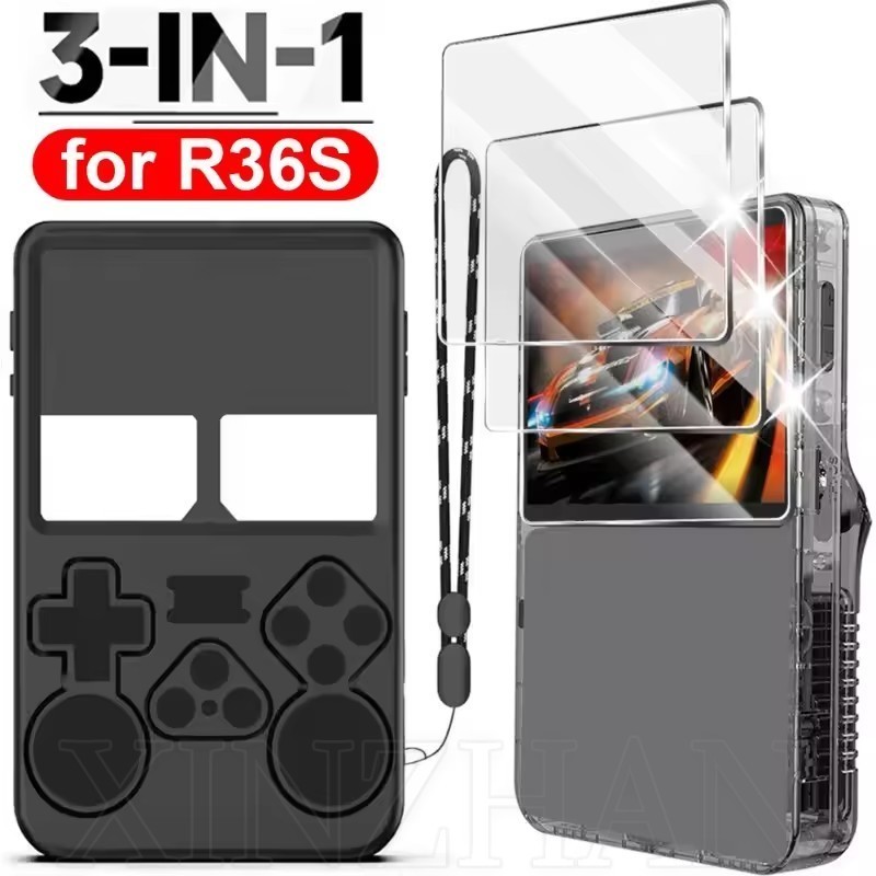 Capa 3 Em 1 + Vidro Para Console De Jogos R36S-Antiarranhões De Silicone Macio-Com Cordão E Protetores De Tela-Filme De