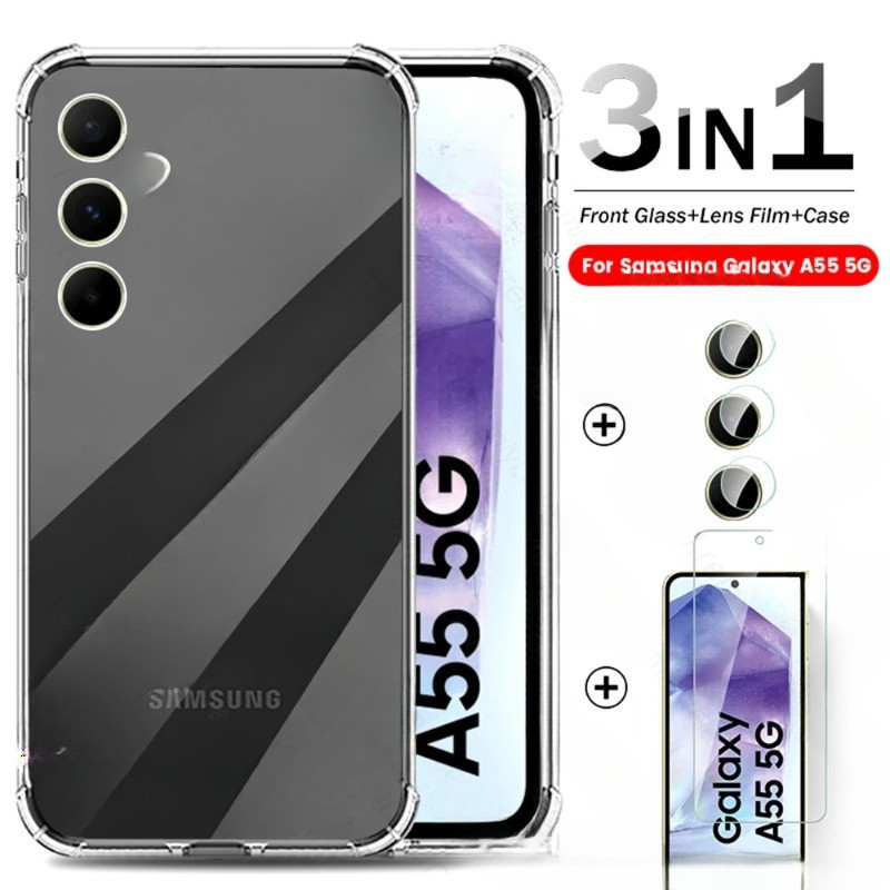 Capa Macia 3 Em 1 De Vidro Protetor De Câmera E Protetores De Tela Frontal TPU Transparente Para Samsung Galaxy A05 A05S A15 A25 A35 A55 M15 M14 M34 M54 4G 5G