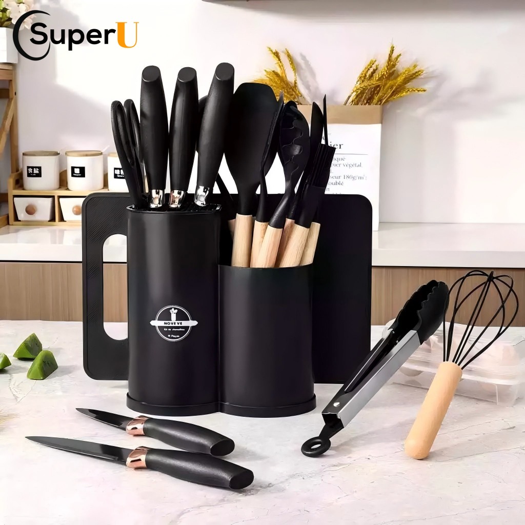 Kit 19 Peças NOVO Completo Jogo Utensílios de Cozinha Luxo Com Tábua em Silicone Espátula Faca Tesoura 2000GR SuperU