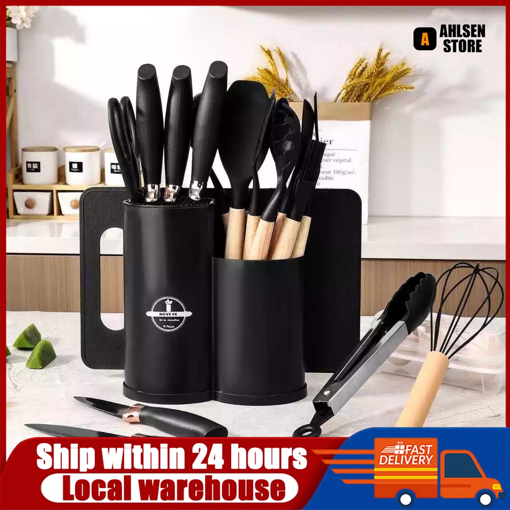 Kit 19 Peças NOVO Completo Jogo Utensílios de Cozinha Luxo Com Tábua em Silicone Espátula Faca Tesoura 1500GR AHLSEN