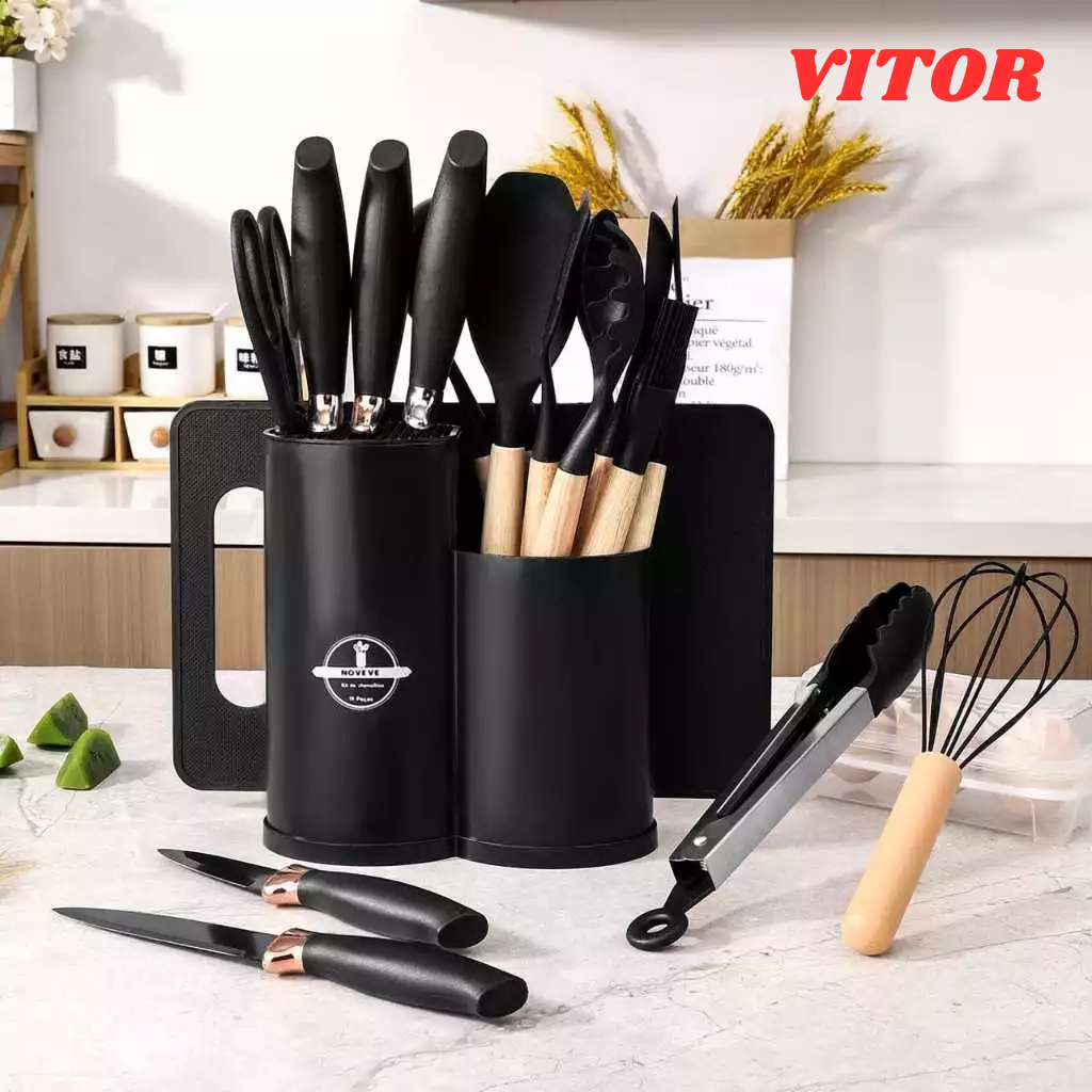 Kit 19 Peças NOVO Completo Jogo Utensílios de Cozinha Luxo Com Tábua em Silicone Espátula Faca Tesoura 1500GR VITOR