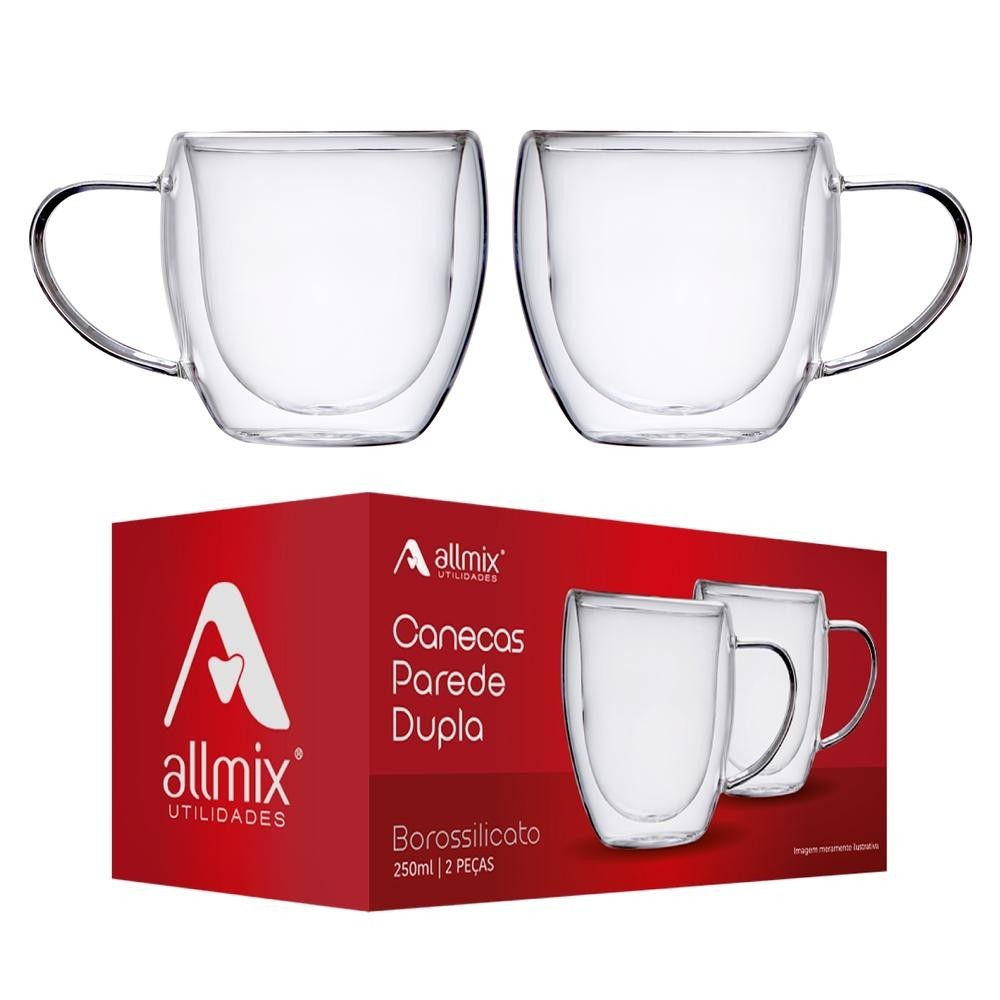 Kit Jogo Conjunto 2 Canecas Vidro Parede Dupla 250ml