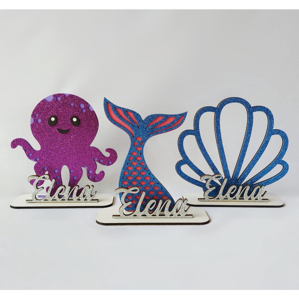Kit Centros de Mesa Fundo Do Mar Cauda Sereia Concha e Polvinho Com Nome Personalizado Para Decoração e Lembrancinha em Mdf e Eva com Glitter