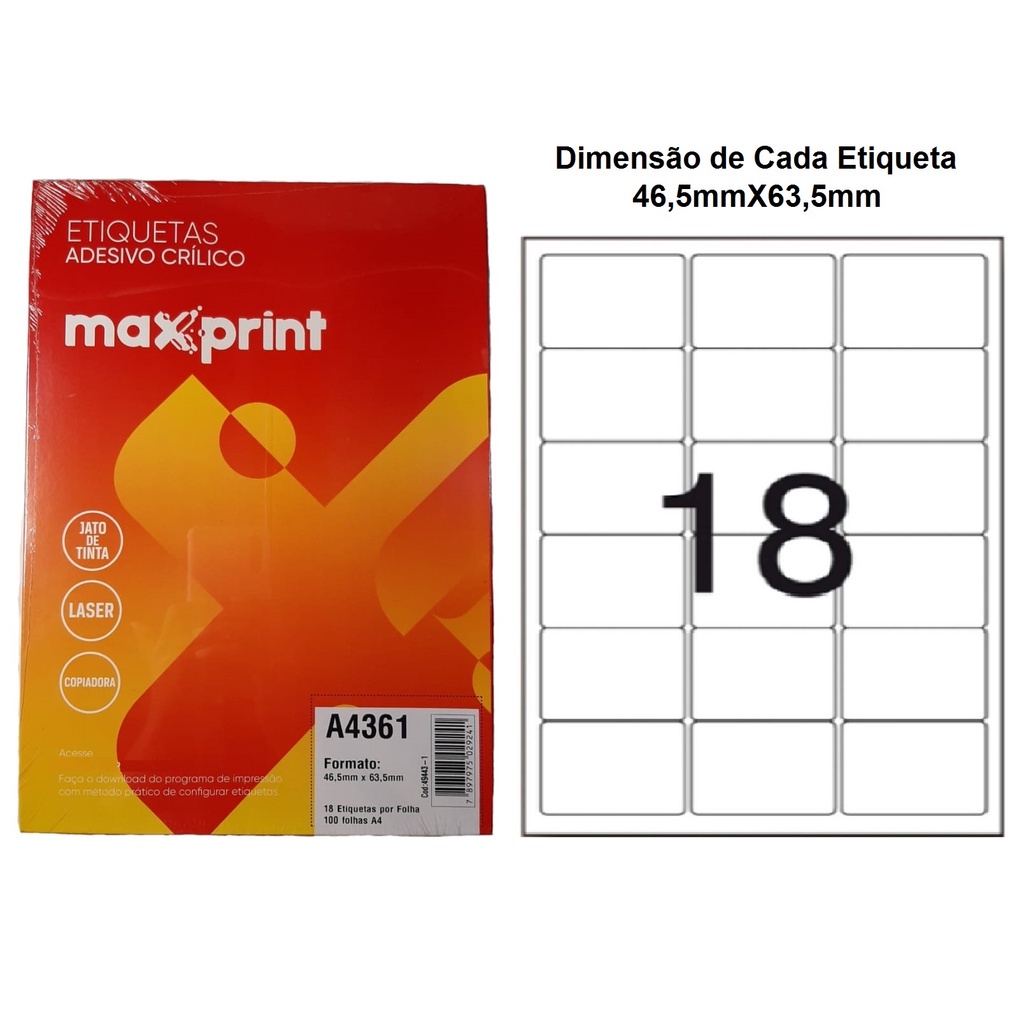 Etiqueta Auto Adesiva Papel A4 18 Etiquetas por Folha Pacote com 100 Folhas Ref.A4361