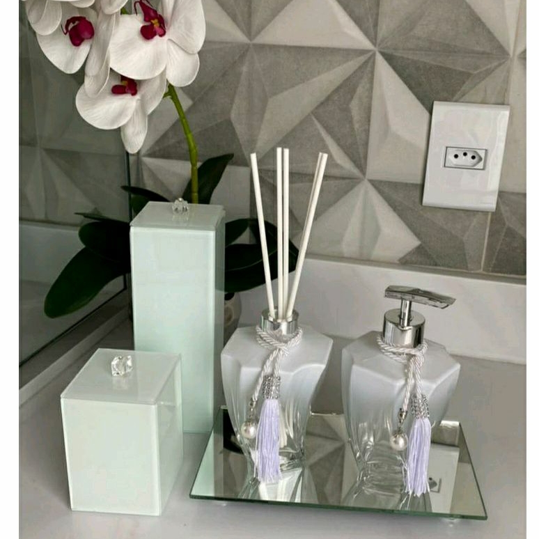Kit Lavabo Banheiro Branco Luxo Difusor Saboneteira e Porta Escova de Dente + Bandeja