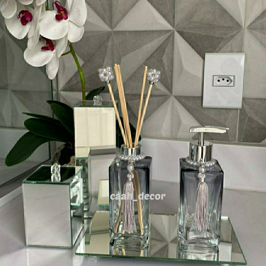 Kit Banheiro Saboneteira e Aromatizador Difusor de Ambiente Com Bandeija + Varetas + Porta Escova Lavabo Luxo