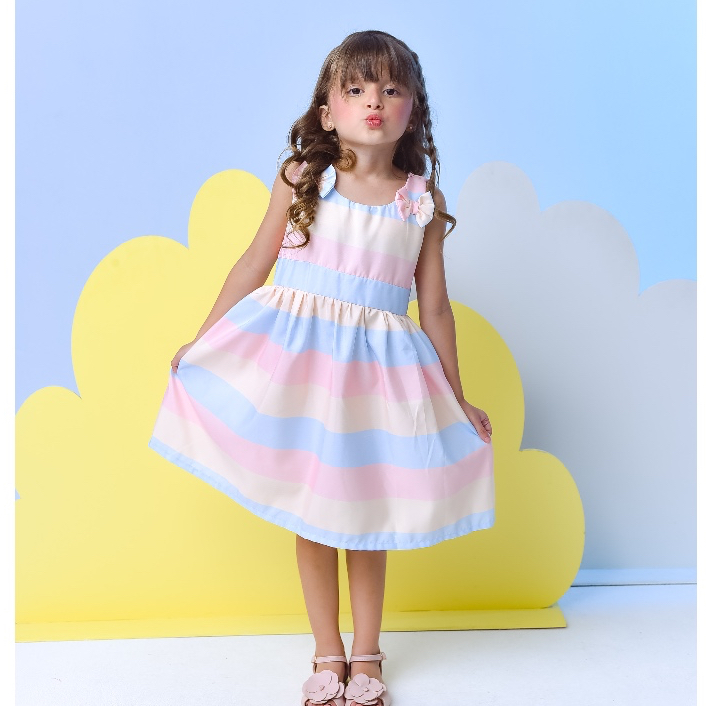 Vestido de Menina infantil Estampas listradas Laço Cintura Rodado Verao festa Aniversário