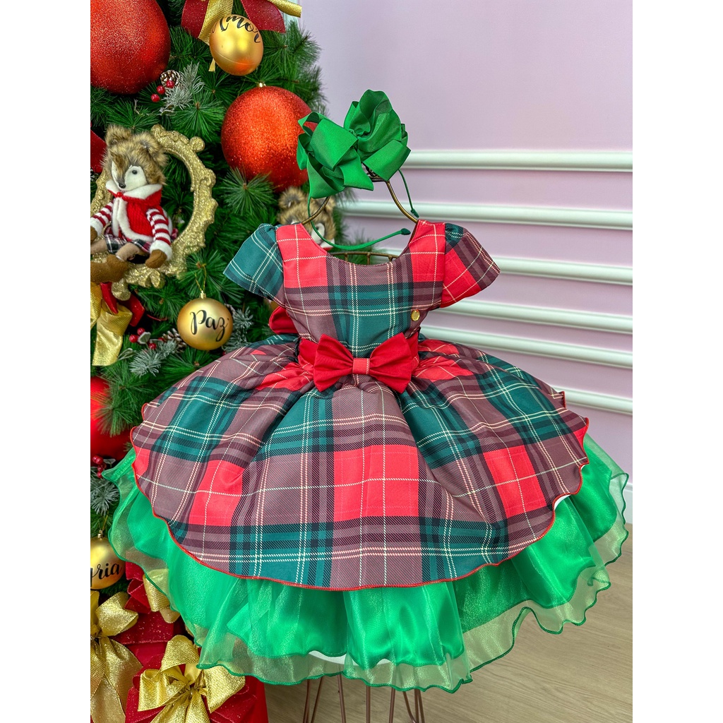 Vestido Natalino Bebê Xadrez Vermelho e Verde com Saia Rodada Look de Natal Infantil