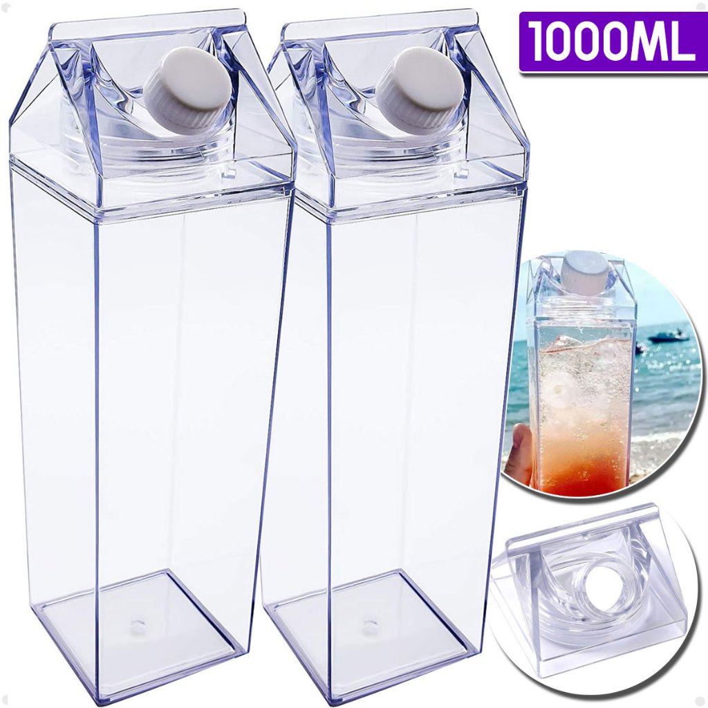 Kit 2 Garrafas Transparente Plástico Acrílico Em Formato Caixa De Leite 1000ml Ou 500ml Sem BPA