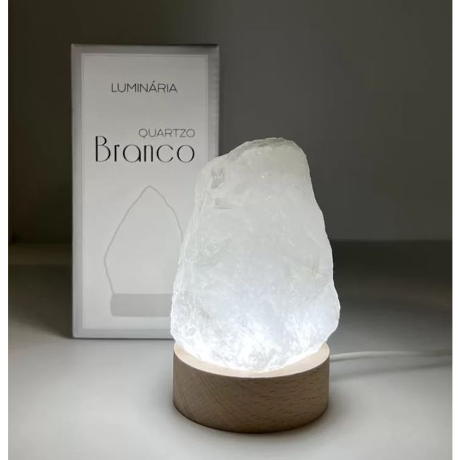 Luminária Abajur Pedra Quartzo Branco com Luz Branca Bivolt