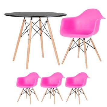 Mesa redonda Eames 90 cm + 3 cadeiras Eiffel DAW Mesa preto com cadeiras rosa pink