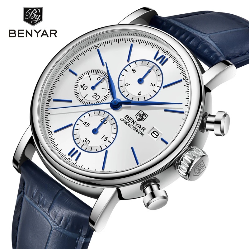 BENYAR Men Watch Chronograph Relógio De Pulso Masculino De Couro Genuíno À Prova D'água Luxo Azul Militar