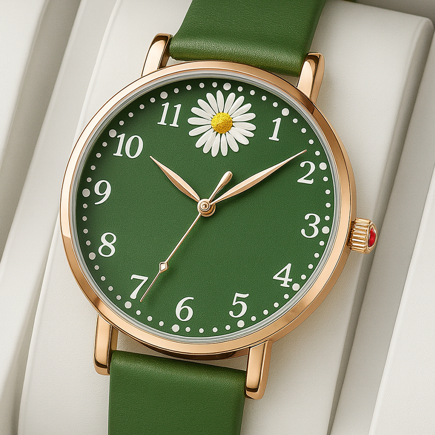 Relógio Feminino Verde com Rosê e detalhe de Margarida